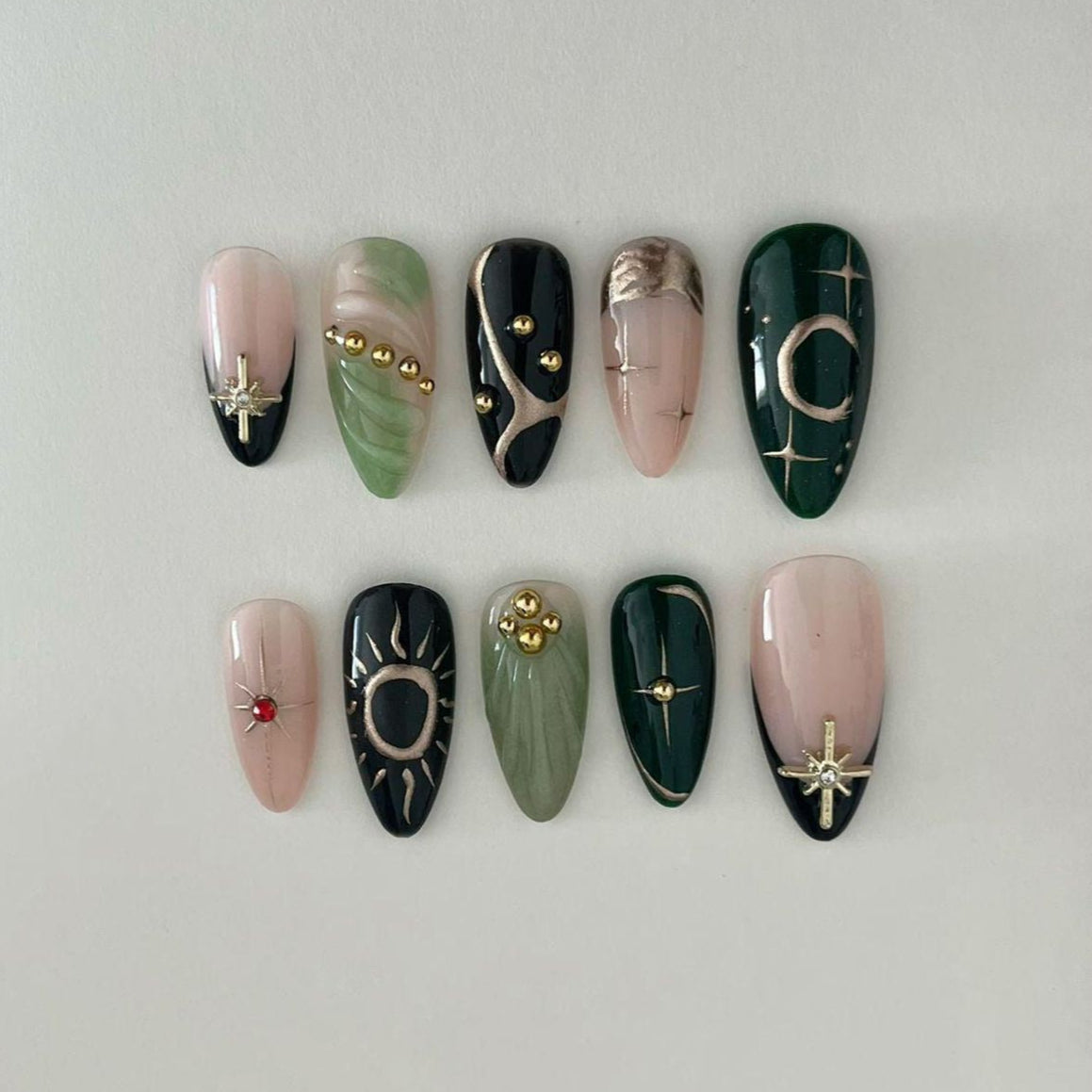 Elevate your manicure with Emerald Eclipse, a sophisticated nail design that captures the deep, alluring hues of emerald under a subtle shadow. Perfect for those seeking elegance with a hint of mystery, these nails complement any style with their refined, timeless appeal.