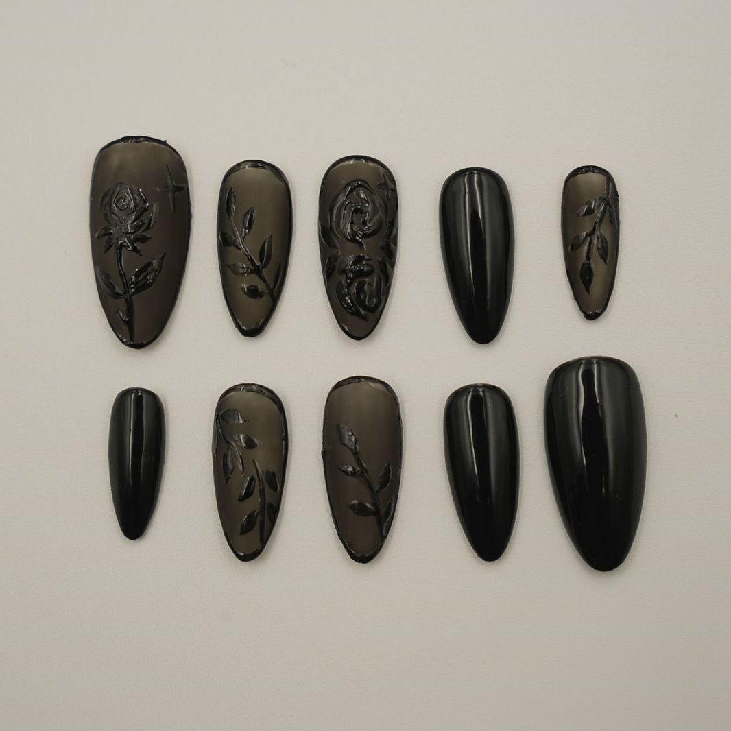 Elevate your look with Midnight Bloom medium almond-shaped nails, designed to offer a perfect balance of elegance and practicality. Their medium length and almond shape complement any style, providing a refined silhouette that enhances your natural nails with a subtle yet striking allure. Ideal for those seeking a sophisticated touch to their manicure.