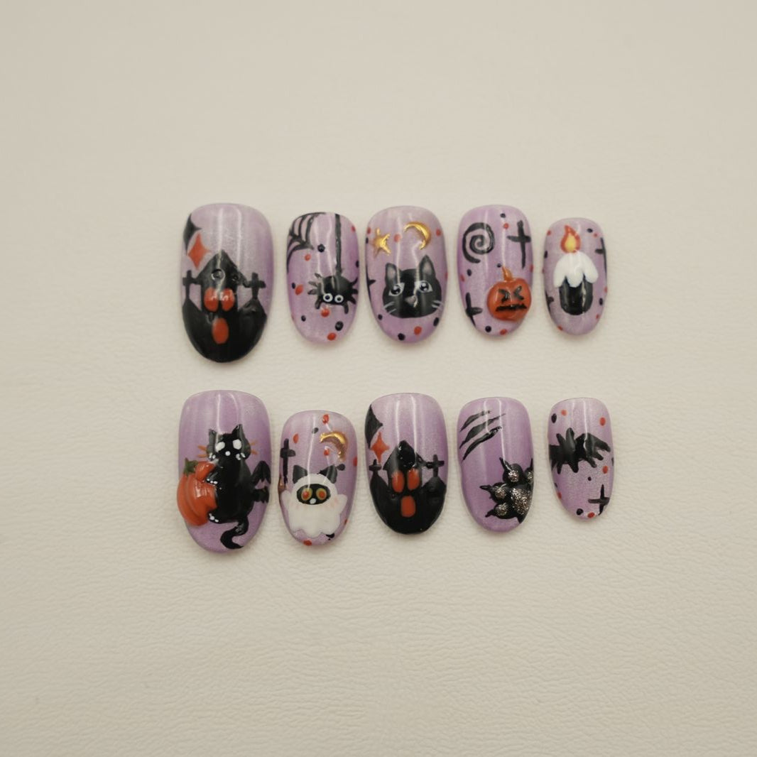 Discover the elegance of the "Spooky Night" nails in an oval shape, combining classic sophistication with a subtle touch of mystery. The smooth, rounded silhouette offers a timeless and flattering look, while the dark, atmospheric design adds refined depth and intrigue. Perfect for those seeking a graceful nail style that captures both beauty and enigma.